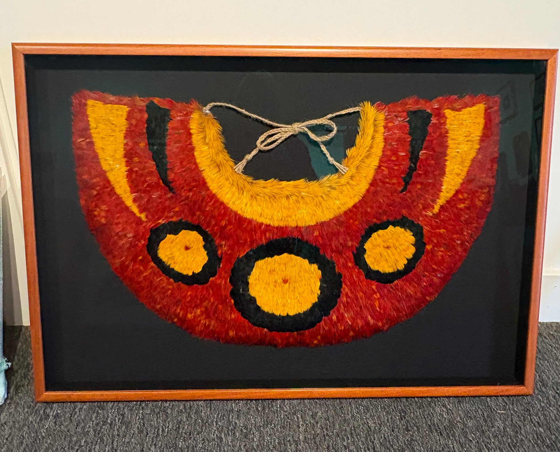 Made from Red and yellow Golden Pheasant w/ black Lady Amherst. Handmade with approximately 15,000 feathers, hand bundled and tied on to specialized netting. Three “piko” represent life and the crescents represent protection. These take several months to make.