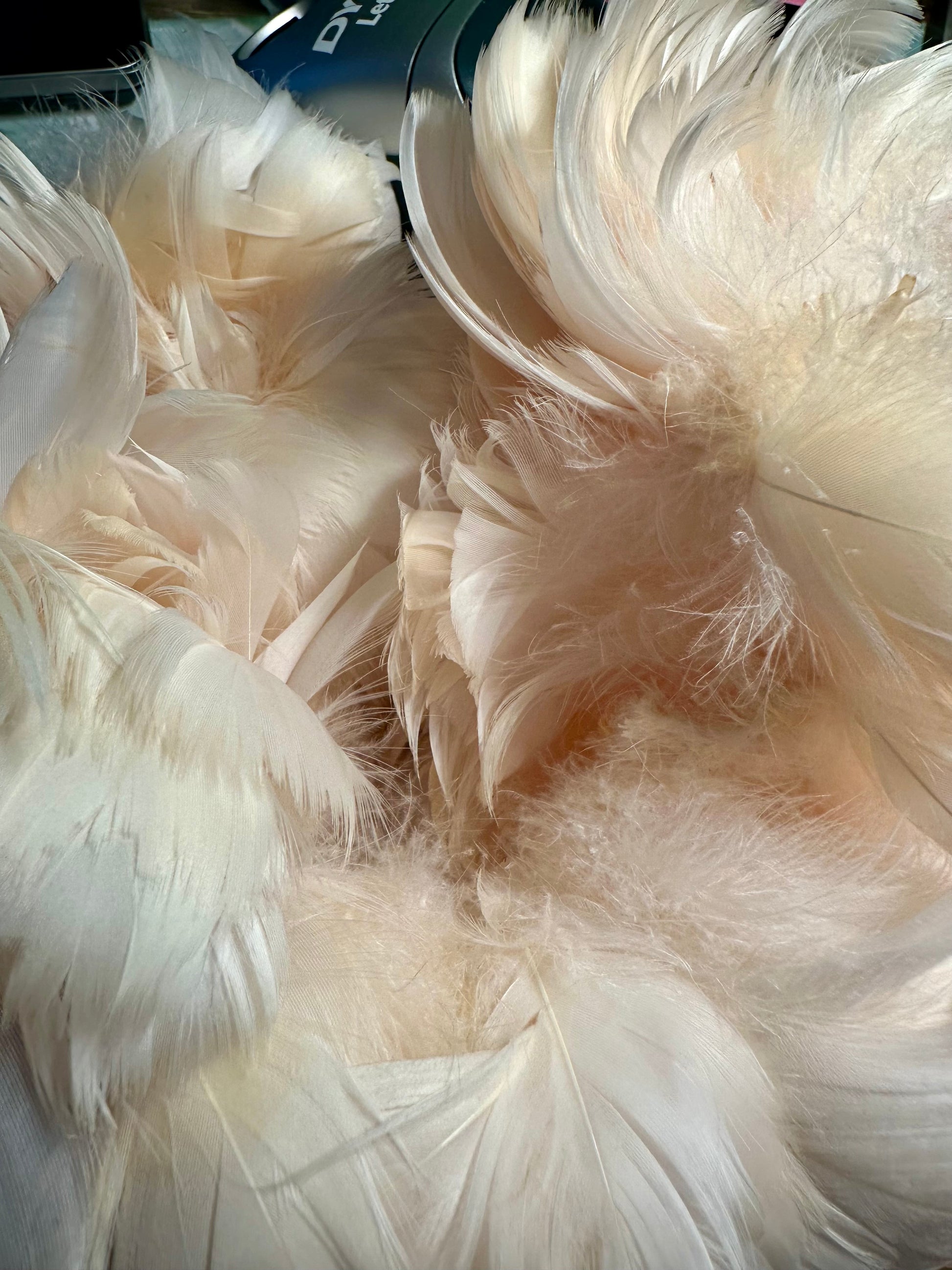 various shades of plums and pink 3-4" goose coquille feathers. Already prepped and ready to use. Please note the photos do not capture the colors exactly.